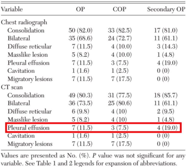 在临床中,胸腔积液在 COP 中是少见表现。一项回顾性研究却显示无论隐源性机化性肺炎或继发性机化性肺炎中胸腔积液的发生率相仿(见图 7)[1]。