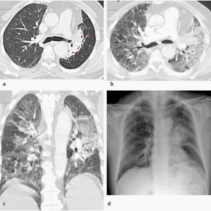 图5 52岁转移性非小细胞肺癌的男性患者出现Pembrolizumab引起的DAD。(a)基线轴向胸部CT示左肺门肿块伴放射治疗引起的病灶周围纤维化(箭头)。(b)轴位和(c)冠状位胸部CT图像,Pembrolizumab开始使用两周后,CT示影响到大多数肺部区域的弥漫性GGO,提示DAD。停用Pembrolizumab,患者住院,并开始1 mg/kg/天的泼尼松治疗。(d)两个月后胸片示肺部阴影消退。