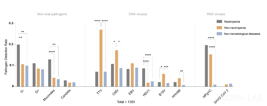 临床上,粒缺患者感染情况备受关注。我们分析了血液病且粒缺、血液病非粒缺,以及非血液病患者的病毒特征。在非病毒病原方面,粒缺患者中G-菌和毛霉菌的流行率更高。TTV、CMV、HHV6B和B19V感染在非粒缺患者中更为常见,而HSV1和非病毒病原感染在粒缺患者中更普遍。HPgV-C感染在粒缺和非粒缺组中均较高(图6)。其他病毒感染未呈现明显差异。